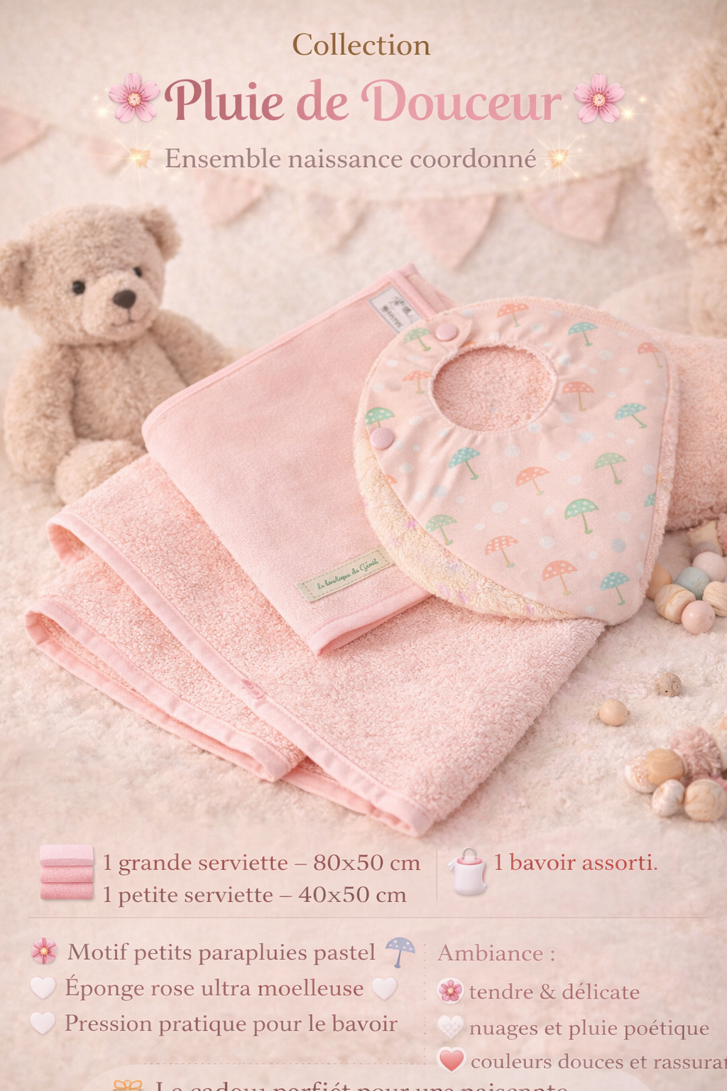 Un univers délicat, aux couleurs douces et rassurantes, parfait pour créer des instants cocooning aprÚs le bain ou lors des premiers repas.